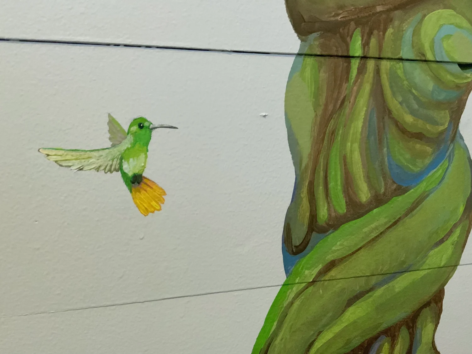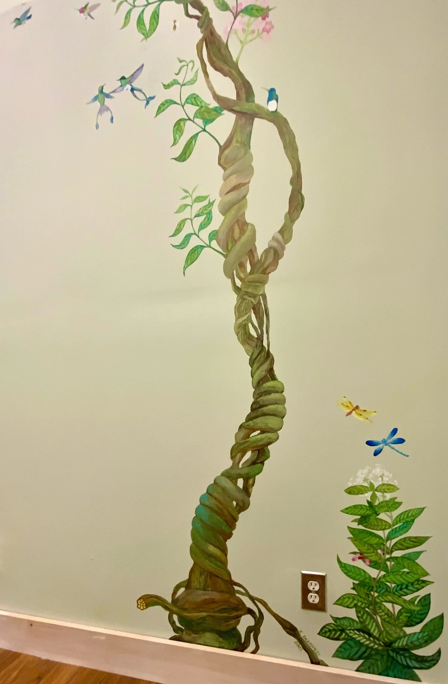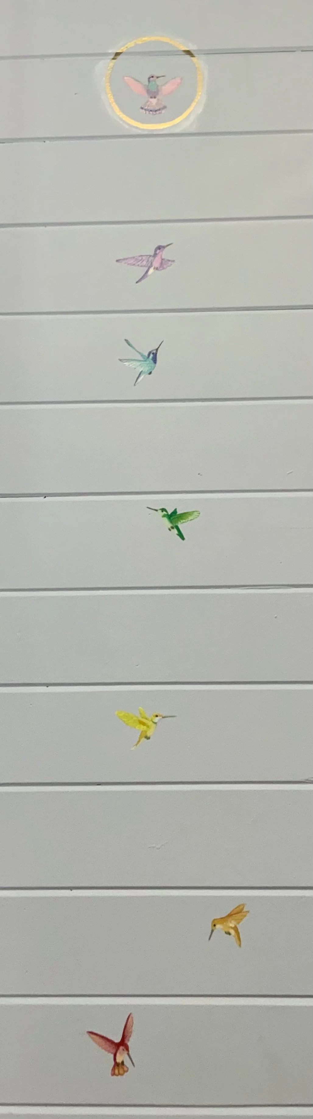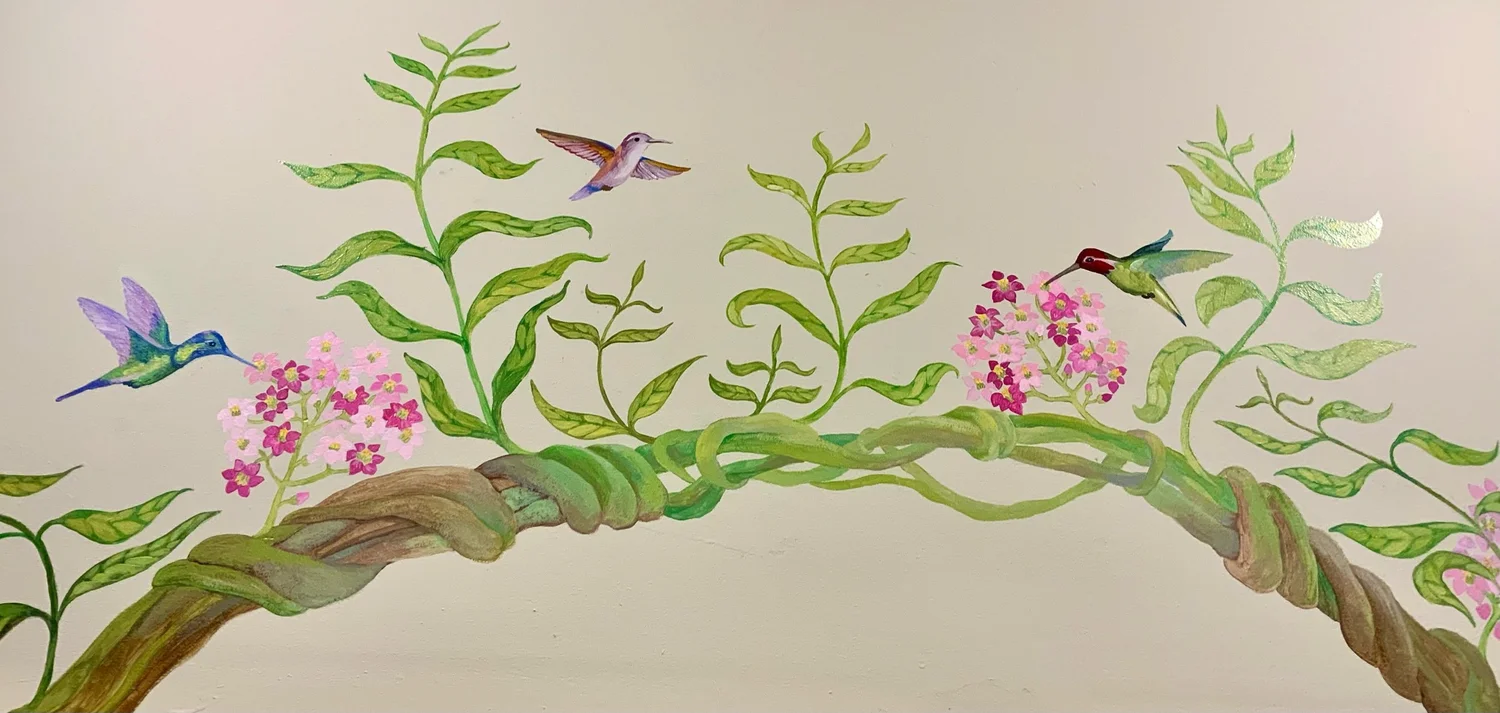Blooming vines, flowers, bees, orioles, and hummingbirds